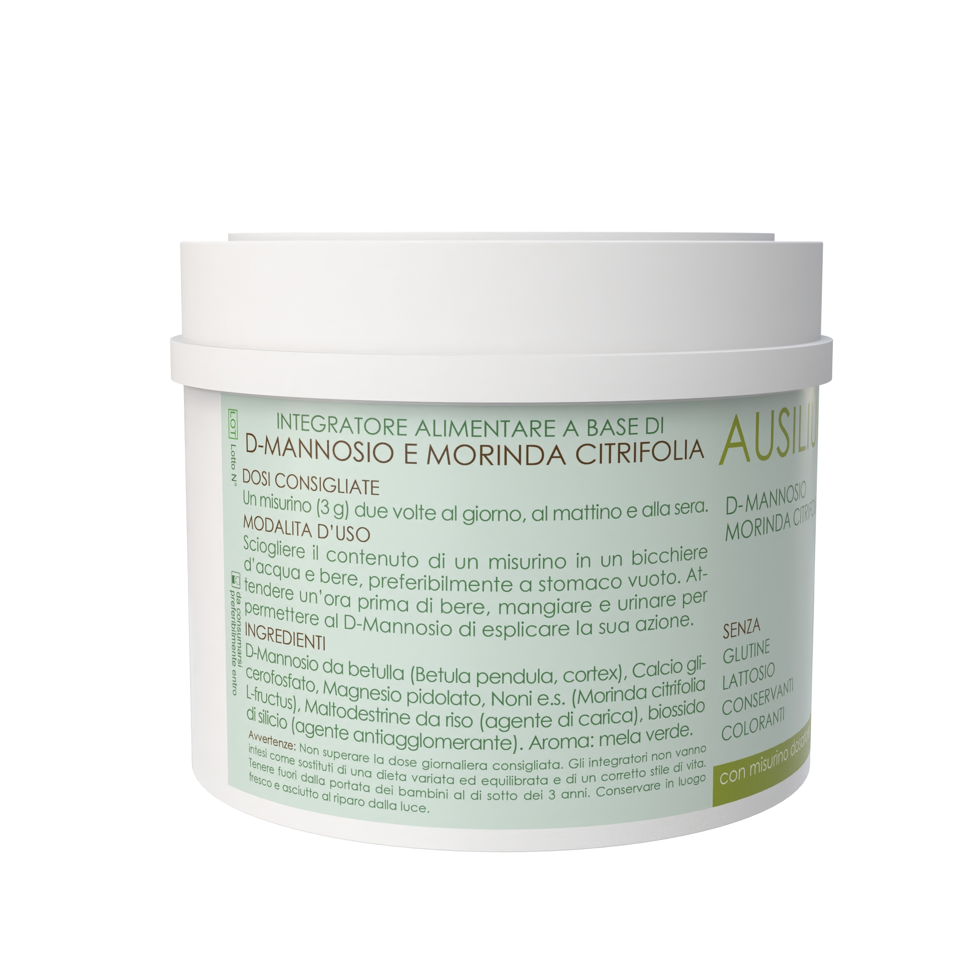 D-Mannosio da betulla (Betula pendula, cortex), Calcio glicerofosfato, Magnesio pidolato, Noni e.s. (Morinda citrifolia L-fructus), Maltodestrine da riso (agente di carica), biossido di silicio (agente antiagglomerante). Aroma: mela verde.