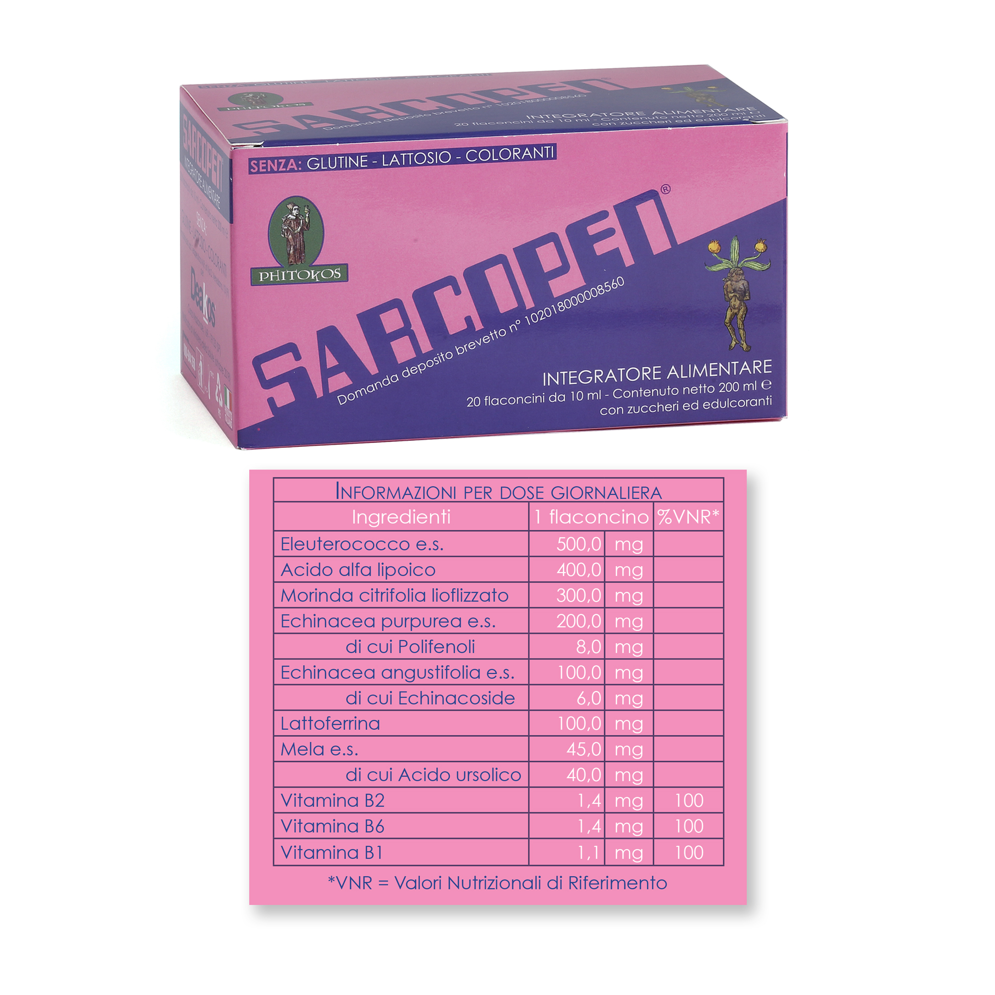 Acqua depurata; Fruttosio; Polidestrosio; Eleuterococco e.s. (Eleutherococcus senticosus Maxim. – radix) titolato allo 0,8% in eleuteroside; Acido alfa lipoico; Morinda liofilizzato (Morinda citrifolia L. – fructus densatus); Echinacea purpurea e.s. (Echinacea purpurea Moench – herba) titolata al 4% in polifenoli; Echinacea angustifolia e.s. (Echinacea angustifolia DC. – radix) titolata al 4% in echinacoside; Lattoferrina (deriva da LATTE); Mela e.s. (Malus Domestica Borkh – fructus) titolata al 90% in acido ursolico; Aroma; Potassio sorbato, Sodio benzoato (conservanti); Sucralosio (edulcorante); Vitamina B2 (Riboflavina 5’-fosfato sodica); Vitamina B6 (Piridossina cloridrato); Vitamina B1 (Tiamina cloridrato).